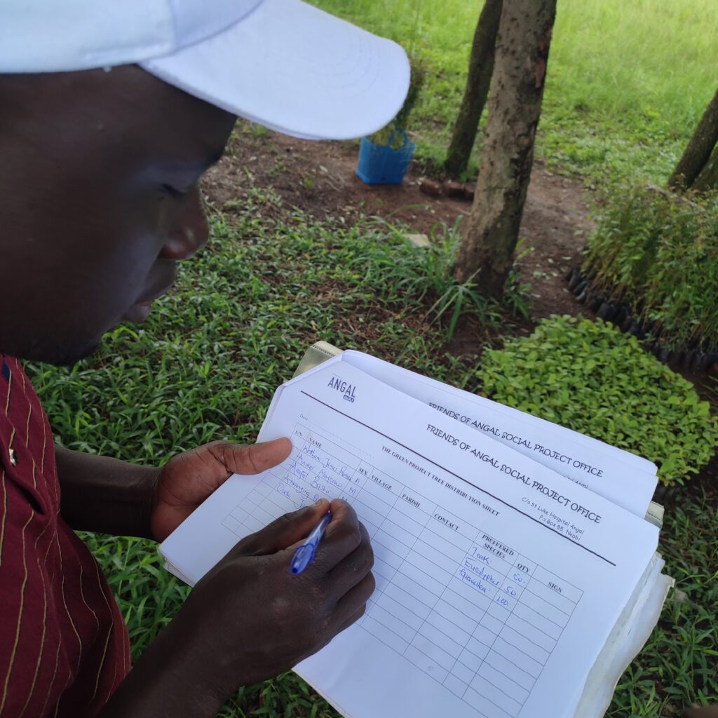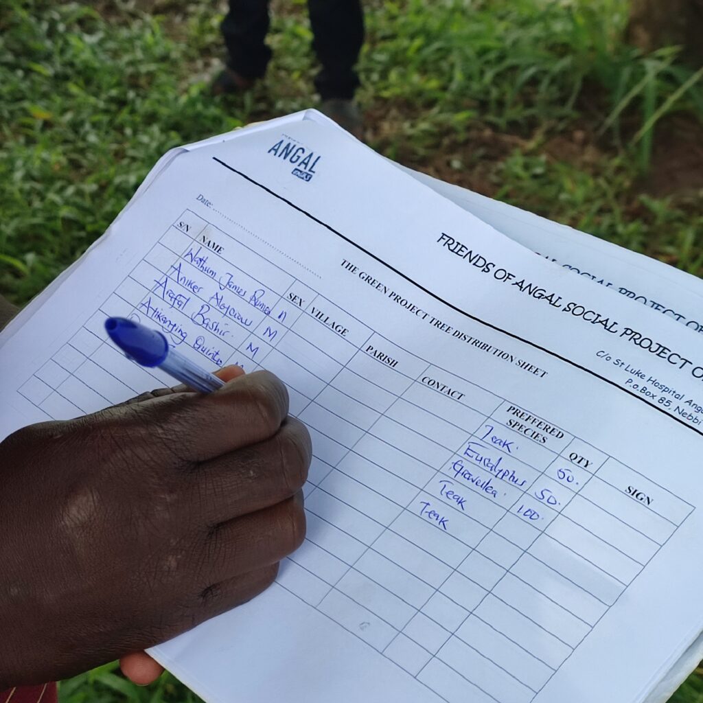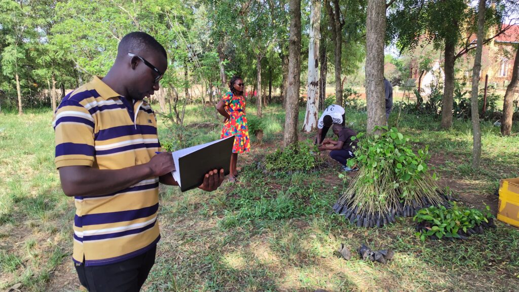 Monitoring visit to the seedling nursery and surrounding planting sites in Angal. Field staff recorded species counts, survival data, and condition notes for trees distributed in previous rounds, alongside an inspection of nursery stock being prepared for the next planting cycle.