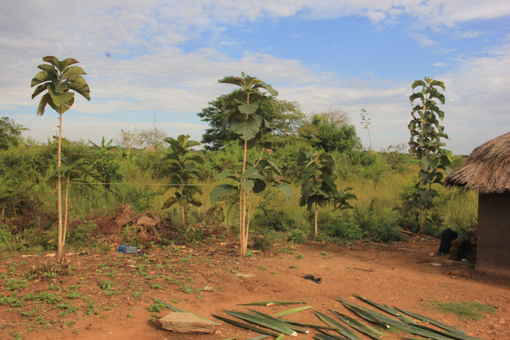 Field visit documenting trees planted across previous rounds and their integration into local farmland. Species visible include teak, eucalyptus, and pine at different stages of growth, alongside agroforestry plots where trees share land with cotton, maize, and other crops.
